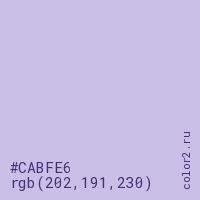 Цвет #CABFE6 в цветовой модели RGB обозначается тремя октетами (202, 191, 230) в десятичном формате и #CABFE6 в шестнадцатиричном (hex) формате, которые являются интенсивностью красного 202 (hex CA), интенсивность зелёного 191 (hex BF) и интенсивность синего 230 (hex E6).