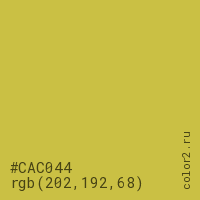 Цвет #CAC044 в цветовой модели RGB обозначается тремя октетами (202, 192, 68) в десятичном формате и #CAC044 в шестнадцатиричном (hex) формате, которые являются интенсивностью красного 202 (hex CA), интенсивность зелёного 192 (hex C0) и интенсивность синего 68 (hex 44).