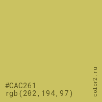 Цвет #CAC261 в цветовой модели RGB обозначается тремя октетами (202, 194, 97) в десятичном формате и #CAC261 в шестнадцатиричном (hex) формате, которые являются интенсивностью красного 202 (hex CA), интенсивность зелёного 194 (hex C2) и интенсивность синего 97 (hex 61).