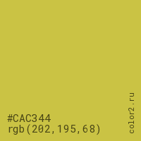 Цвет #CAC344 в цветовой модели RGB обозначается тремя октетами (202, 195, 68) в десятичном формате и #CAC344 в шестнадцатиричном (hex) формате, которые являются интенсивностью красного 202 (hex CA), интенсивность зелёного 195 (hex C3) и интенсивность синего 68 (hex 44).