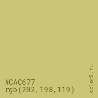 Цвет #CAC677 в цветовой модели RGB обозначается тремя октетами (202, 198, 119) в десятичном формате и #CAC677 в шестнадцатиричном (hex) формате, которые являются интенсивностью красного 202 (hex CA), интенсивность зелёного 198 (hex C6) и интенсивность синего 119 (hex 77).