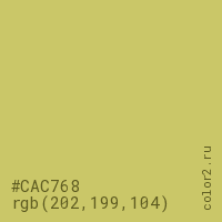 Цвет #CAC768 в цветовой модели RGB обозначается тремя октетами (202, 199, 104) в десятичном формате и #CAC768 в шестнадцатиричном (hex) формате, которые являются интенсивностью красного 202 (hex CA), интенсивность зелёного 199 (hex C7) и интенсивность синего 104 (hex 68).