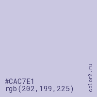 Цвет #CAC7E1 в цветовой модели RGB обозначается тремя октетами (202, 199, 225) в десятичном формате и #CAC7E1 в шестнадцатиричном (hex) формате, которые являются интенсивностью красного 202 (hex CA), интенсивность зелёного 199 (hex C7) и интенсивность синего 225 (hex E1).