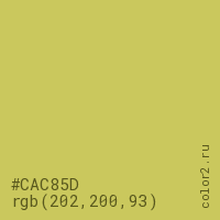 Цвет #CAC85D в цветовой модели RGB обозначается тремя октетами (202, 200, 93) в десятичном формате и #CAC85D в шестнадцатиричном (hex) формате, которые являются интенсивностью красного 202 (hex CA), интенсивность зелёного 200 (hex C8) и интенсивность синего 93 (hex 5D).