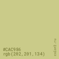 Цвет #CAC986 в цветовой модели RGB обозначается тремя октетами (202, 201, 134) в десятичном формате и #CAC986 в шестнадцатиричном (hex) формате, которые являются интенсивностью красного 202 (hex CA), интенсивность зелёного 201 (hex C9) и интенсивность синего 134 (hex 86).