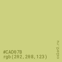 Цвет #CAD07B в цветовой модели RGB обозначается тремя октетами (202, 208, 123) в десятичном формате и #CAD07B в шестнадцатиричном (hex) формате, которые являются интенсивностью красного 202 (hex CA), интенсивность зелёного 208 (hex D0) и интенсивность синего 123 (hex 7B).