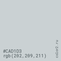 Цвет #CAD1D3 в цветовой модели RGB обозначается тремя октетами (202, 209, 211) в десятичном формате и #CAD1D3 в шестнадцатиричном (hex) формате, которые являются интенсивностью красного 202 (hex CA), интенсивность зелёного 209 (hex D1) и интенсивность синего 211 (hex D3).