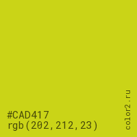 Цвет #CAD417 в цветовой модели RGB обозначается тремя октетами (202, 212, 23) в десятичном формате и #CAD417 в шестнадцатиричном (hex) формате, которые являются интенсивностью красного 202 (hex CA), интенсивность зелёного 212 (hex D4) и интенсивность синего 23 (hex 17).