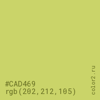 Цвет #CAD469 в цветовой модели RGB обозначается тремя октетами (202, 212, 105) в десятичном формате и #CAD469 в шестнадцатиричном (hex) формате, которые являются интенсивностью красного 202 (hex CA), интенсивность зелёного 212 (hex D4) и интенсивность синего 105 (hex 69).