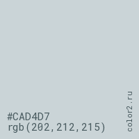 Цвет #CAD4D7 в цветовой модели RGB обозначается тремя октетами (202, 212, 215) в десятичном формате и #CAD4D7 в шестнадцатиричном (hex) формате, которые являются интенсивностью красного 202 (hex CA), интенсивность зелёного 212 (hex D4) и интенсивность синего 215 (hex D7).