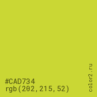 Цвет #CAD734 в цветовой модели RGB обозначается тремя октетами (202, 215, 52) в десятичном формате и #CAD734 в шестнадцатиричном (hex) формате, которые являются интенсивностью красного 202 (hex CA), интенсивность зелёного 215 (hex D7) и интенсивность синего 52 (hex 34).