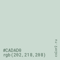 Цвет #CADAD0 в цветовой модели RGB обозначается тремя октетами (202, 218, 208) в десятичном формате и #CADAD0 в шестнадцатиричном (hex) формате, которые являются интенсивностью красного 202 (hex CA), интенсивность зелёного 218 (hex DA) и интенсивность синего 208 (hex D0).