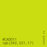 Цвет #CADD11 в цветовой модели RGB обозначается тремя октетами (202, 221, 17) в десятичном формате и #CADD11 в шестнадцатиричном (hex) формате, которые являются интенсивностью красного 202 (hex CA), интенсивность зелёного 221 (hex DD) и интенсивность синего 17 (hex 11).