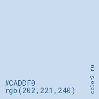 Цвет #CADDF0 в цветовой модели RGB обозначается тремя октетами (202, 221, 240) в десятичном формате и #CADDF0 в шестнадцатиричном (hex) формате, которые являются интенсивностью красного 202 (hex CA), интенсивность зелёного 221 (hex DD) и интенсивность синего 240 (hex F0).