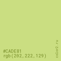 Цвет #CADE81 в цветовой модели RGB обозначается тремя октетами (202, 222, 129) в десятичном формате и #CADE81 в шестнадцатиричном (hex) формате, которые являются интенсивностью красного 202 (hex CA), интенсивность зелёного 222 (hex DE) и интенсивность синего 129 (hex 81).