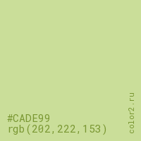 Цвет #CADE99 в цветовой модели RGB обозначается тремя октетами (202, 222, 153) в десятичном формате и #CADE99 в шестнадцатиричном (hex) формате, которые являются интенсивностью красного 202 (hex CA), интенсивность зелёного 222 (hex DE) и интенсивность синего 153 (hex 99).