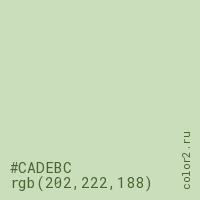 Цвет #CADEBC в цветовой модели RGB обозначается тремя октетами (202, 222, 188) в десятичном формате и #CADEBC в шестнадцатиричном (hex) формате, которые являются интенсивностью красного 202 (hex CA), интенсивность зелёного 222 (hex DE) и интенсивность синего 188 (hex BC).