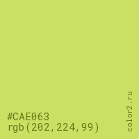 Цвет #CAE063 в цветовой модели RGB обозначается тремя октетами (202, 224, 99) в десятичном формате и #CAE063 в шестнадцатиричном (hex) формате, которые являются интенсивностью красного 202 (hex CA), интенсивность зелёного 224 (hex E0) и интенсивность синего 99 (hex 63).