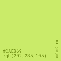 Цвет #CAEB69 в цветовой модели RGB обозначается тремя октетами (202, 235, 105) в десятичном формате и #CAEB69 в шестнадцатиричном (hex) формате, которые являются интенсивностью красного 202 (hex CA), интенсивность зелёного 235 (hex EB) и интенсивность синего 105 (hex 69).