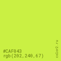 Цвет #CAF043 в цветовой модели RGB обозначается тремя октетами (202, 240, 67) в десятичном формате и #CAF043 в шестнадцатиричном (hex) формате, которые являются интенсивностью красного 202 (hex CA), интенсивность зелёного 240 (hex F0) и интенсивность синего 67 (hex 43).