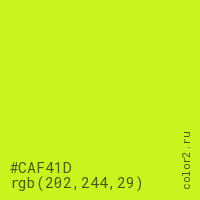 Цвет RGB(202, 244, 29) в процентом отношении количества цвета состоит из 79.2% красного (red), 95.7% зелёного (green) и 11.4% синего (blue).