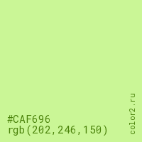 Цвет #CAF696 в цветовой модели RGB обозначается тремя октетами (202, 246, 150) в десятичном формате и #CAF696 в шестнадцатиричном (hex) формате, которые являются интенсивностью красного 202 (hex CA), интенсивность зелёного 246 (hex F6) и интенсивность синего 150 (hex 96).