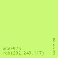 Цвет #CAF975 в цветовой модели RGB обозначается тремя октетами (202, 249, 117) в десятичном формате и #CAF975 в шестнадцатиричном (hex) формате, которые являются интенсивностью красного 202 (hex CA), интенсивность зелёного 249 (hex F9) и интенсивность синего 117 (hex 75).