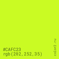 Цвет #CAFC23 в цветовой модели RGB обозначается тремя октетами (202, 252, 35) в десятичном формате и #CAFC23 в шестнадцатиричном (hex) формате, которые являются интенсивностью красного 202 (hex CA), интенсивность зелёного 252 (hex FC) и интенсивность синего 35 (hex 23).