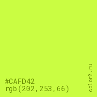 Цвет #CAFD42 в цветовой модели RGB обозначается тремя октетами (202, 253, 66) в десятичном формате и #CAFD42 в шестнадцатиричном (hex) формате, которые являются интенсивностью красного 202 (hex CA), интенсивность зелёного 253 (hex FD) и интенсивность синего 66 (hex 42).