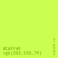 Цвет #CAFF4F в цветовой модели RGB обозначается тремя октетами (202, 255, 79) в десятичном формате и #CAFF4F в шестнадцатиричном (hex) формате, которые являются интенсивностью красного 202 (hex CA), интенсивность зелёного 255 (hex FF) и интенсивность синего 79 (hex 4F).