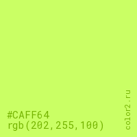 Цвет #CAFF64 в цветовой модели RGB обозначается тремя октетами (202, 255, 100) в десятичном формате и #CAFF64 в шестнадцатиричном (hex) формате, которые являются интенсивностью красного 202 (hex CA), интенсивность зелёного 255 (hex FF) и интенсивность синего 100 (hex 64).
