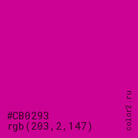 Цвет #CB0293 в цветовой модели RGB обозначается тремя октетами (203, 2, 147) в десятичном формате и #CB0293 в шестнадцатиричном (hex) формате, которые являются интенсивностью красного 203 (hex CB), интенсивность зелёного 2 (hex 02) и интенсивность синего 147 (hex 93).