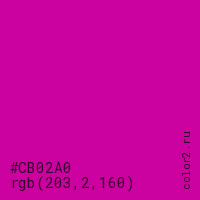 Цвет #CB02A0 в цветовой модели RGB обозначается тремя октетами (203, 2, 160) в десятичном формате и #CB02A0 в шестнадцатиричном (hex) формате, которые являются интенсивностью красного 203 (hex CB), интенсивность зелёного 2 (hex 02) и интенсивность синего 160 (hex A0).