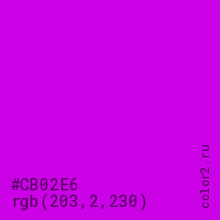 Цвет #CB02E6 в цветовой модели RGB обозначается тремя октетами (203, 2, 230) в десятичном формате и #CB02E6 в шестнадцатиричном (hex) формате, которые являются интенсивностью красного 203 (hex CB), интенсивность зелёного 2 (hex 02) и интенсивность синего 230 (hex E6).