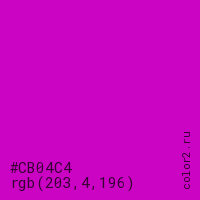 Цвет #CB04C4 в цветовой модели RGB обозначается тремя октетами (203, 4, 196) в десятичном формате и #CB04C4 в шестнадцатиричном (hex) формате, которые являются интенсивностью красного 203 (hex CB), интенсивность зелёного 4 (hex 04) и интенсивность синего 196 (hex C4).