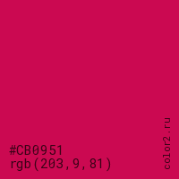 Цвет #CB0951 в цветовой модели RGB обозначается тремя октетами (203, 9, 81) в десятичном формате и #CB0951 в шестнадцатиричном (hex) формате, которые являются интенсивностью красного 203 (hex CB), интенсивность зелёного 9 (hex 09) и интенсивность синего 81 (hex 51).