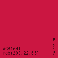 Цвет #CB1641 в цветовой модели RGB обозначается тремя октетами (203, 22, 65) в десятичном формате и #CB1641 в шестнадцатиричном (hex) формате, которые являются интенсивностью красного 203 (hex CB), интенсивность зелёного 22 (hex 16) и интенсивность синего 65 (hex 41).