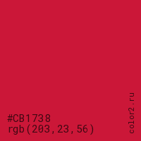 Цвет #CB1738 в цветовой модели RGB обозначается тремя октетами (203, 23, 56) в десятичном формате и #CB1738 в шестнадцатиричном (hex) формате, которые являются интенсивностью красного 203 (hex CB), интенсивность зелёного 23 (hex 17) и интенсивность синего 56 (hex 38).