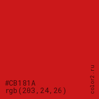 Цвет #CB181A в цветовой модели RGB обозначается тремя октетами (203, 24, 26) в десятичном формате и #CB181A в шестнадцатиричном (hex) формате, которые являются интенсивностью красного 203 (hex CB), интенсивность зелёного 24 (hex 18) и интенсивность синего 26 (hex 1A).