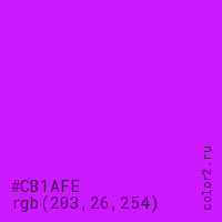 Цвет #CB1AFE в цветовой модели RGB обозначается тремя октетами (203, 26, 254) в десятичном формате и #CB1AFE в шестнадцатиричном (hex) формате, которые являются интенсивностью красного 203 (hex CB), интенсивность зелёного 26 (hex 1A) и интенсивность синего 254 (hex FE).