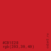 Цвет #CB1E28 в цветовой модели RGB обозначается тремя октетами (203, 30, 40) в десятичном формате и #CB1E28 в шестнадцатиричном (hex) формате, которые являются интенсивностью красного 203 (hex CB), интенсивность зелёного 30 (hex 1E) и интенсивность синего 40 (hex 28).