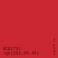 Цвет #CB2731 в цветовой модели RGB обозначается тремя октетами (203, 39, 49) в десятичном формате и #CB2731 в шестнадцатиричном (hex) формате, которые являются интенсивностью красного 203 (hex CB), интенсивность зелёного 39 (hex 27) и интенсивность синего 49 (hex 31).