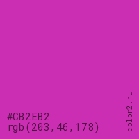 Цвет #CB2EB2 в цветовой модели RGB обозначается тремя октетами (203, 46, 178) в десятичном формате и #CB2EB2 в шестнадцатиричном (hex) формате, которые являются интенсивностью красного 203 (hex CB), интенсивность зелёного 46 (hex 2E) и интенсивность синего 178 (hex B2).