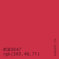 Цвет #CB3047 в цветовой модели RGB обозначается тремя октетами (203, 48, 71) в десятичном формате и #CB3047 в шестнадцатиричном (hex) формате, которые являются интенсивностью красного 203 (hex CB), интенсивность зелёного 48 (hex 30) и интенсивность синего 71 (hex 47).