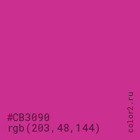 Цвет #CB3090 в цветовой модели RGB обозначается тремя октетами (203, 48, 144) в десятичном формате и #CB3090 в шестнадцатиричном (hex) формате, которые являются интенсивностью красного 203 (hex CB), интенсивность зелёного 48 (hex 30) и интенсивность синего 144 (hex 90).