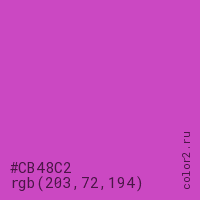 Цвет #CB48C2 в цветовой модели RGB обозначается тремя октетами (203, 72, 194) в десятичном формате и #CB48C2 в шестнадцатиричном (hex) формате, которые являются интенсивностью красного 203 (hex CB), интенсивность зелёного 72 (hex 48) и интенсивность синего 194 (hex C2).