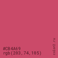 Цвет #CB4A69 в цветовой модели RGB обозначается тремя октетами (203, 74, 105) в десятичном формате и #CB4A69 в шестнадцатиричном (hex) формате, которые являются интенсивностью красного 203 (hex CB), интенсивность зелёного 74 (hex 4A) и интенсивность синего 105 (hex 69).