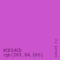Цвет #CB54CD в цветовой модели RGB обозначается тремя октетами (203, 84, 205) в десятичном формате и #CB54CD в шестнадцатиричном (hex) формате, которые являются интенсивностью красного 203 (hex CB), интенсивность зелёного 84 (hex 54) и интенсивность синего 205 (hex CD).