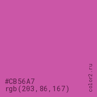 Цвет #CB56A7 в цветовой модели RGB обозначается тремя октетами (203, 86, 167) в десятичном формате и #CB56A7 в шестнадцатиричном (hex) формате, которые являются интенсивностью красного 203 (hex CB), интенсивность зелёного 86 (hex 56) и интенсивность синего 167 (hex A7).