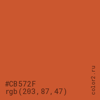 Цвет #CB572F в цветовой модели RGB обозначается тремя октетами (203, 87, 47) в десятичном формате и #CB572F в шестнадцатиричном (hex) формате, которые являются интенсивностью красного 203 (hex CB), интенсивность зелёного 87 (hex 57) и интенсивность синего 47 (hex 2F).